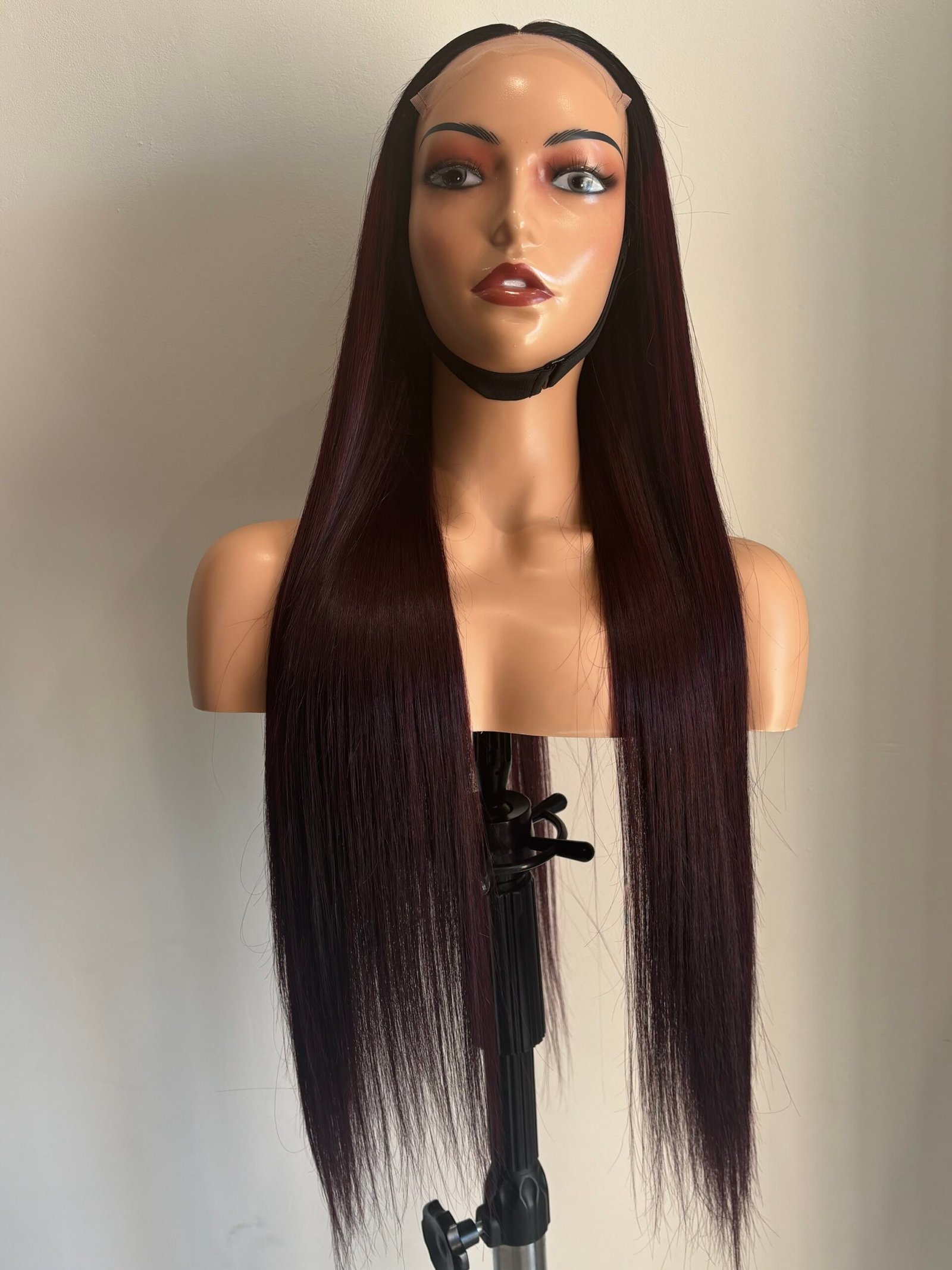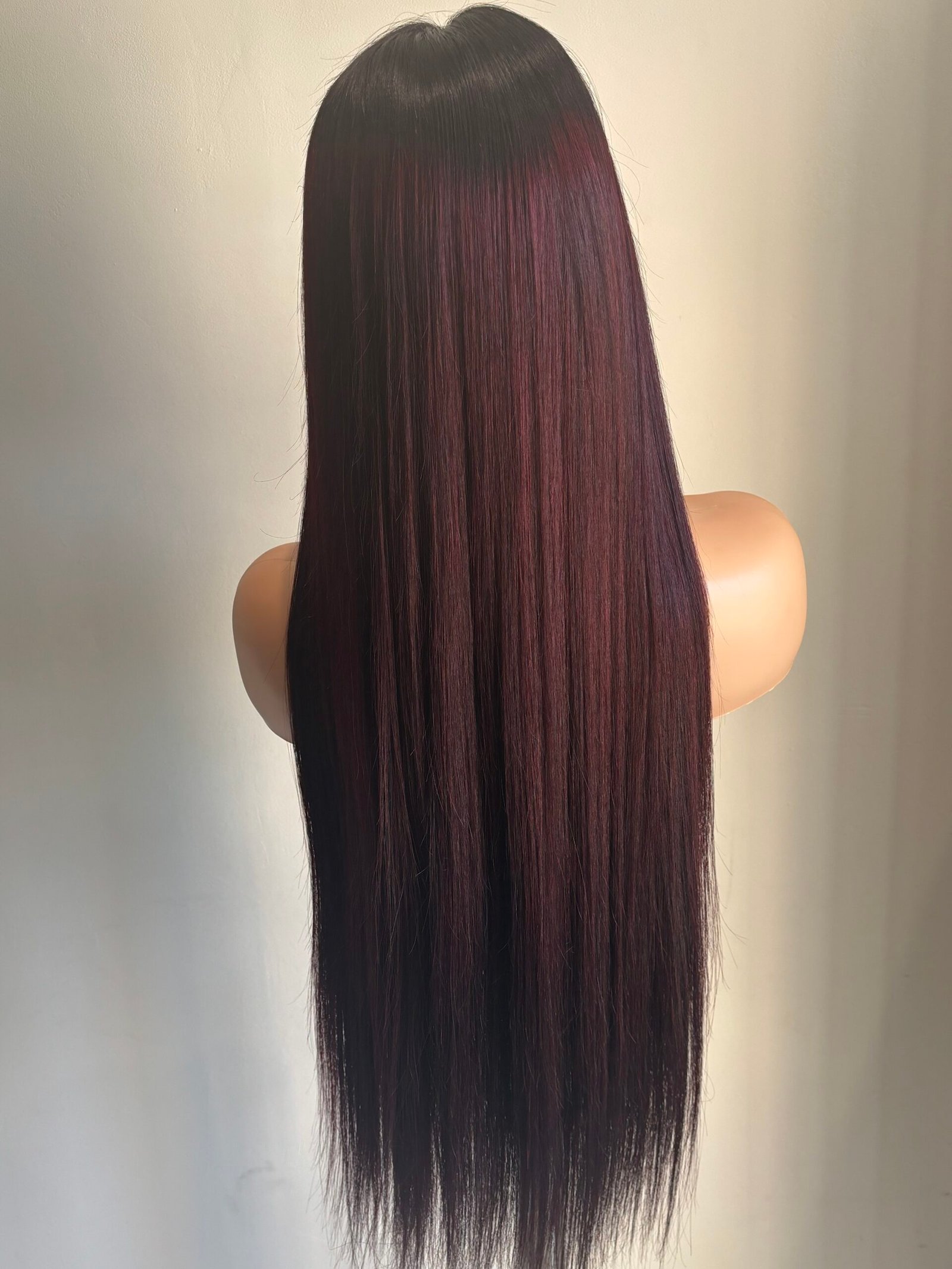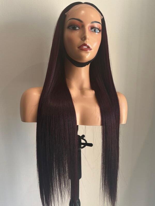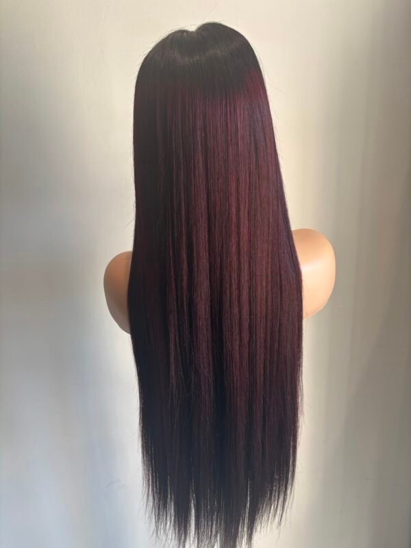 ✨ Présentant des racines noires profondes qui se transforment en une magnifique longueur de rouge bordeaux, cette perruque est le mélange parfait de mystère et de audace.
